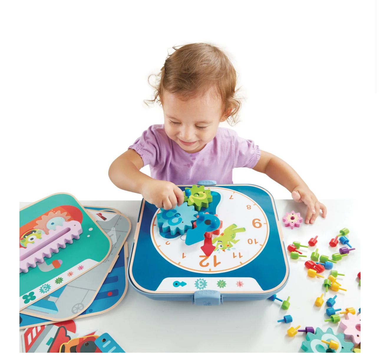 Aprende cómo funciona y gira los engranajes con este fantástico set de juego. coloca los pernos, los engranajes y las tarjetas decoradas sobre uno de los seis fondos; a continuación gira los engranajes para ver cómo cobran vida