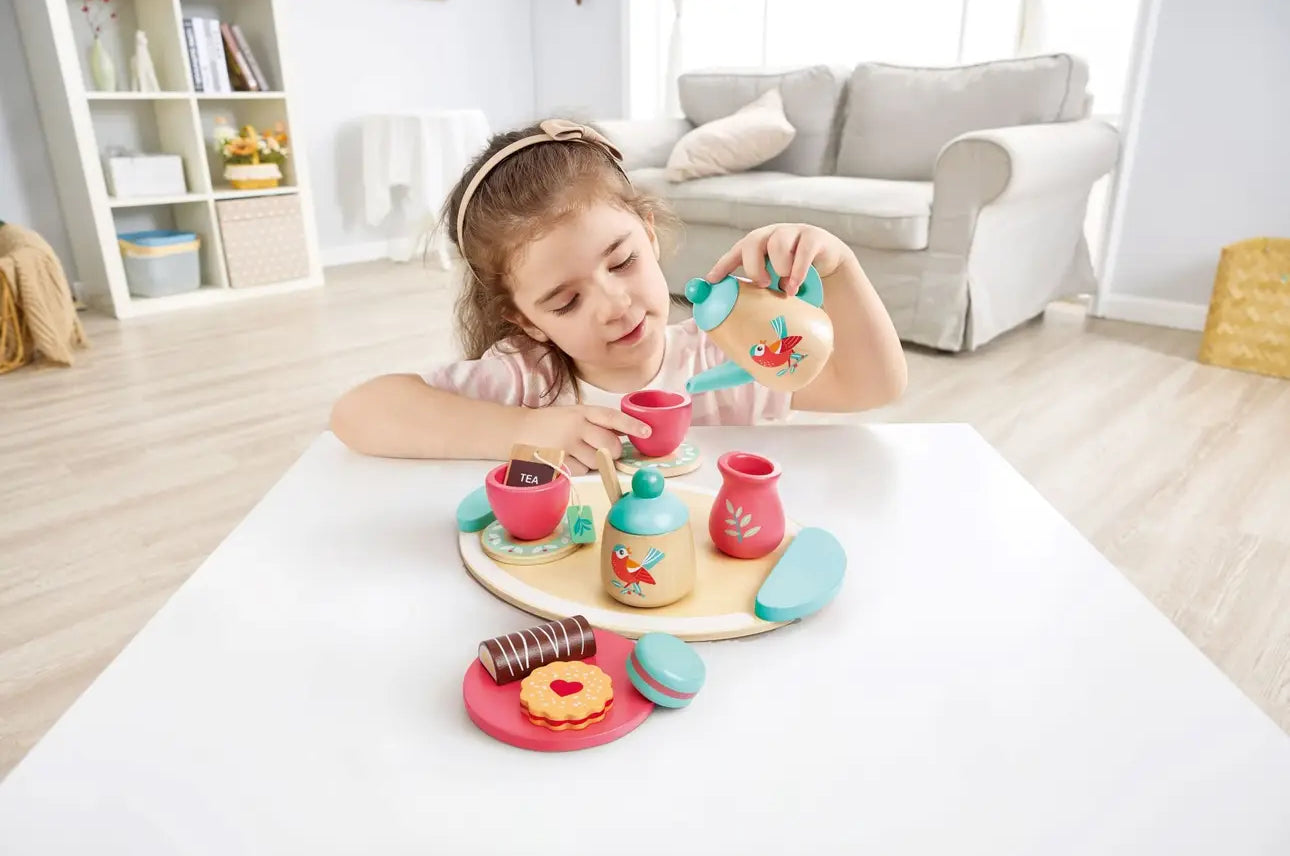 El juego de té está hecho de madera e incluye una tableta, una tetera con tapa, dos tazas de té con platillo, un azucarero, una jarra de leche, una bolsita de té y tres postres en un plato.
