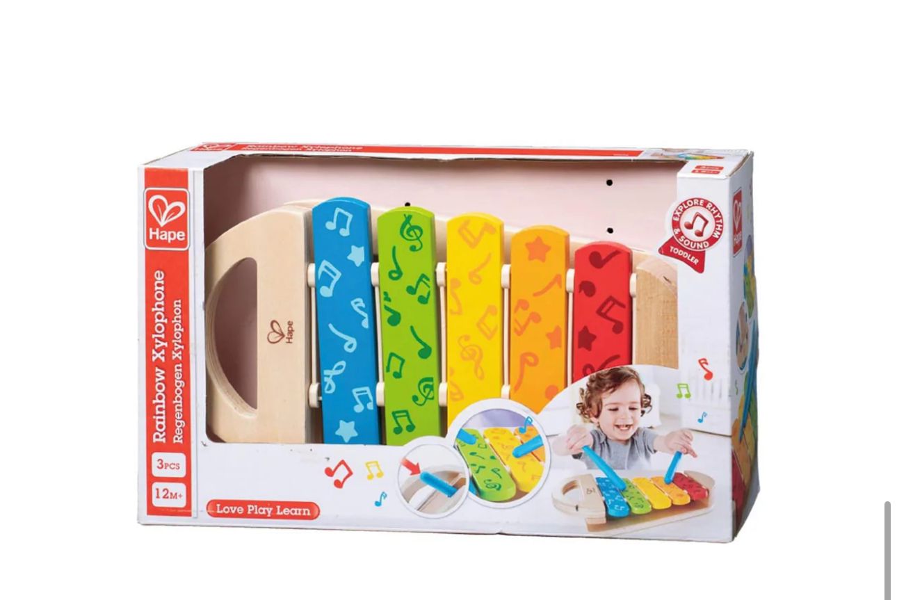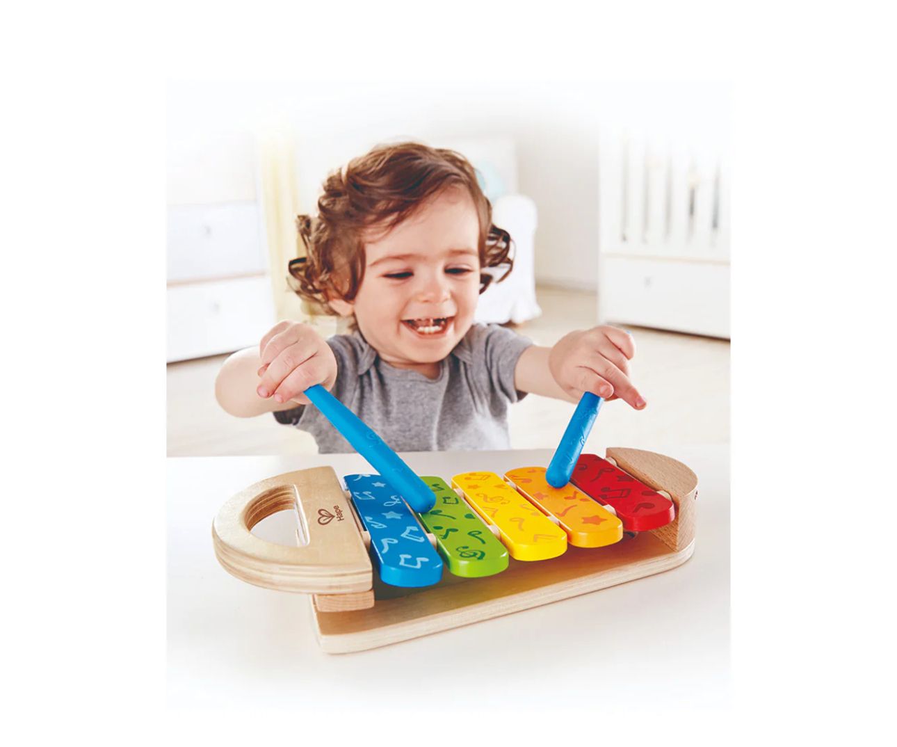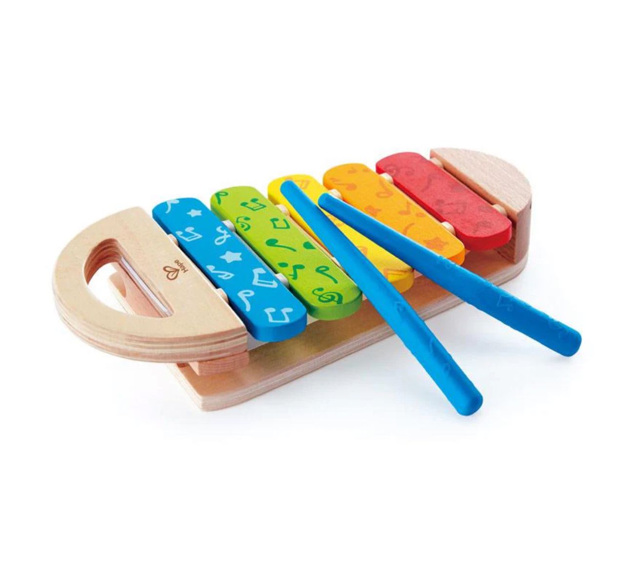 Xilófono de madera con palitos de plastico. Cada tecla emite un sonido diferente cuando lo tocan con las baquetas. Medidas: 27,5 x 13,7 x 4,3 cm Edad: +12 meses